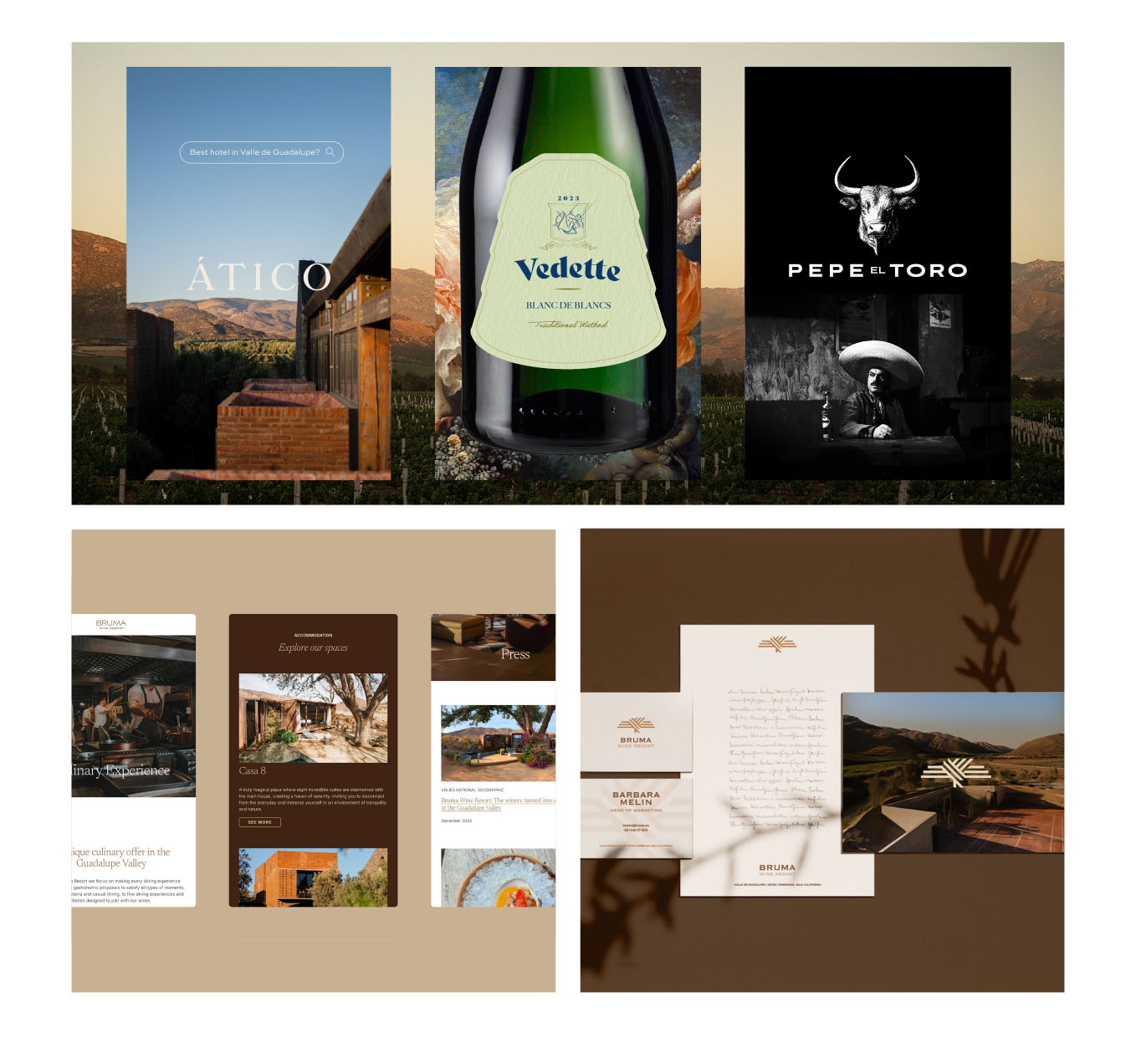 They brought in Alejandro de Acosta, one of Mexico’s most visionary sustainable architects, and invited us to craft the visual universe of their world: from the hotel identities Casa Ocho and Casa Montaña, to Fauna and Bruma Wine Garden, the restaurants led by renowned chef David Hussong, as well as the full branding system for Bruma Vinícola and its many wine labels.